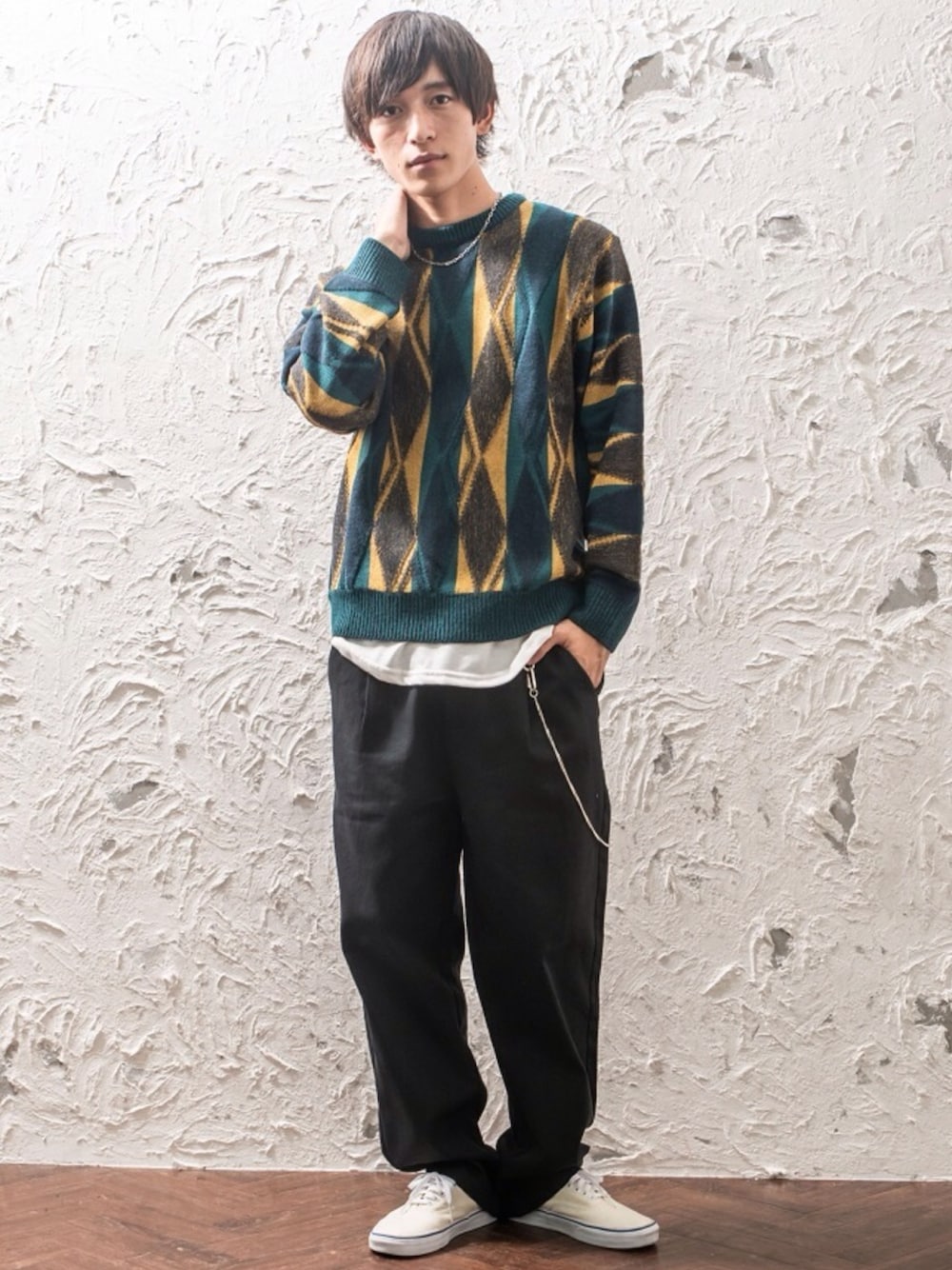 REONのニット/セーター「レトロダイヤ柄クルーニット」を使ったコーディネート