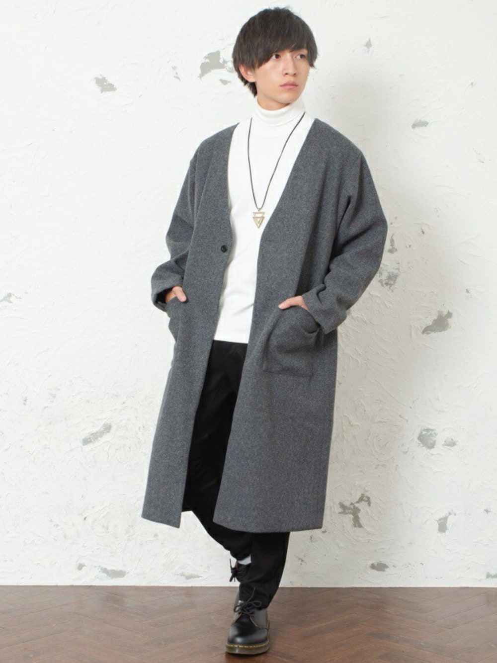 REONのノーカラージャケット「フラノ素材ノーカラーロングコート アウター」を使ったコーディネート