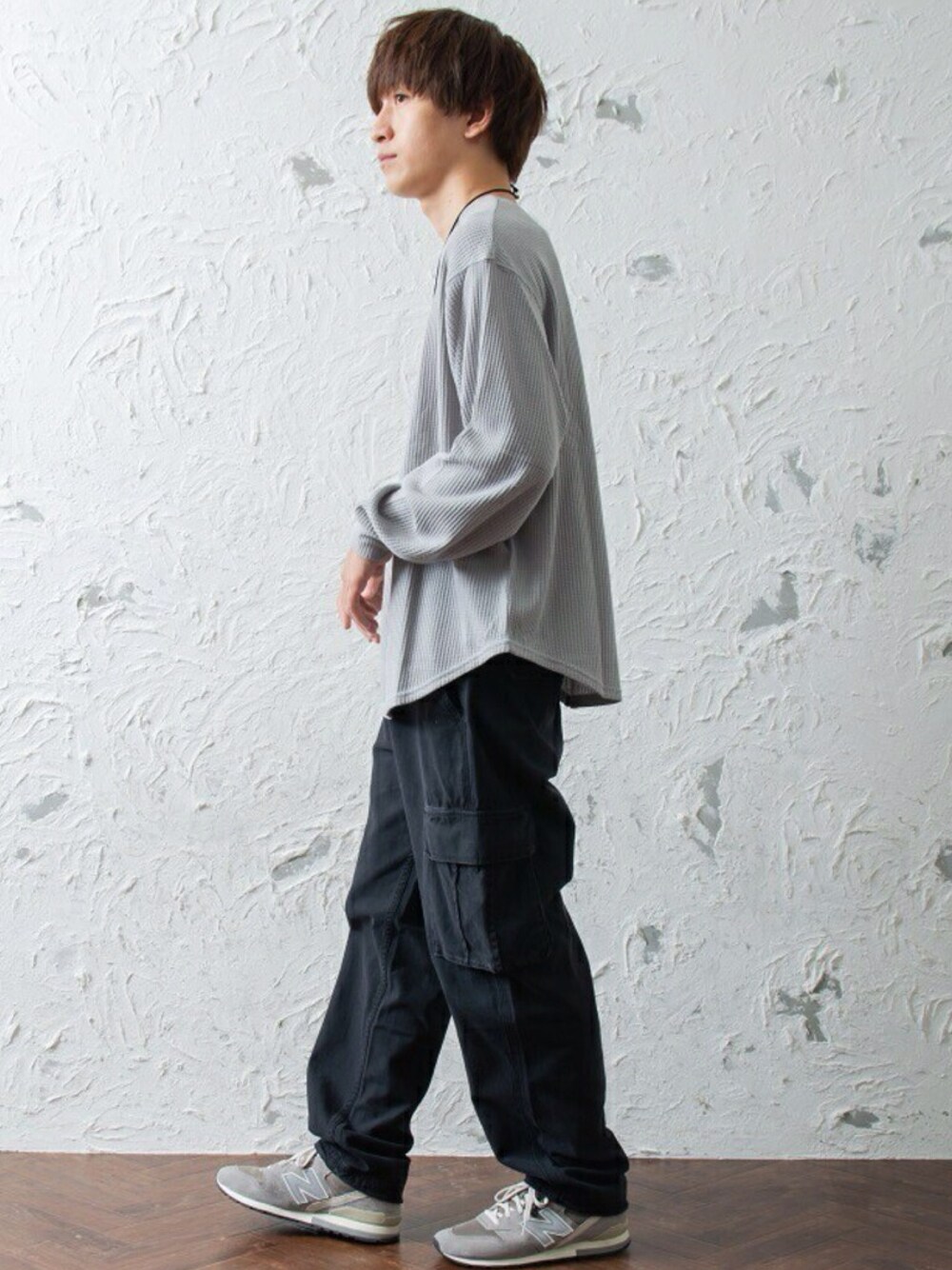 REONのTシャツ/カットソー「メンズ長袖ビッグシルエットワッフル2WAYロンT【ヘンリーネック⇔クルーネック】」を使ったコーディネート