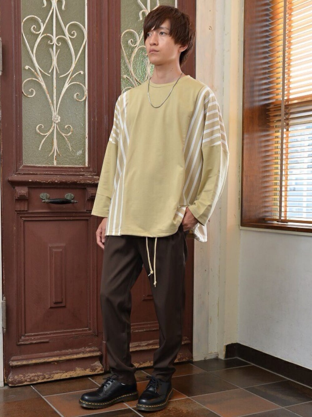 REONのTシャツ/カットソー「メンズ長袖ストライプ切替ビッグシルエットロンT」を使ったコーディネート