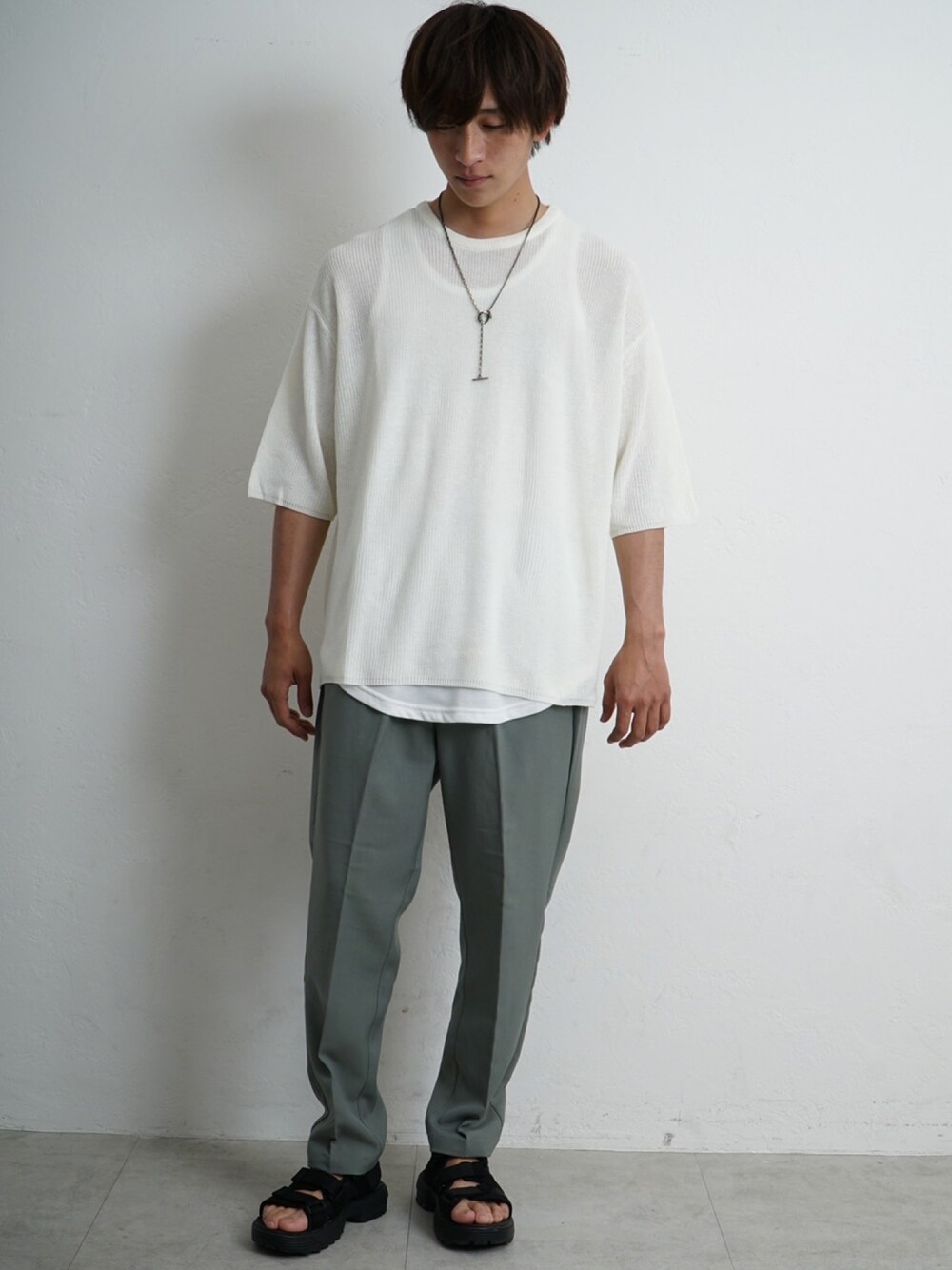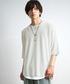 REONのニット/セーター「【MinoriTY】ビッグシルエットサマーニット メンズ クルーネック 5分袖/半袖 Tシャツ 麻タッチ畔編み セーター 無地 夏服 秋服」を使ったコーディネート