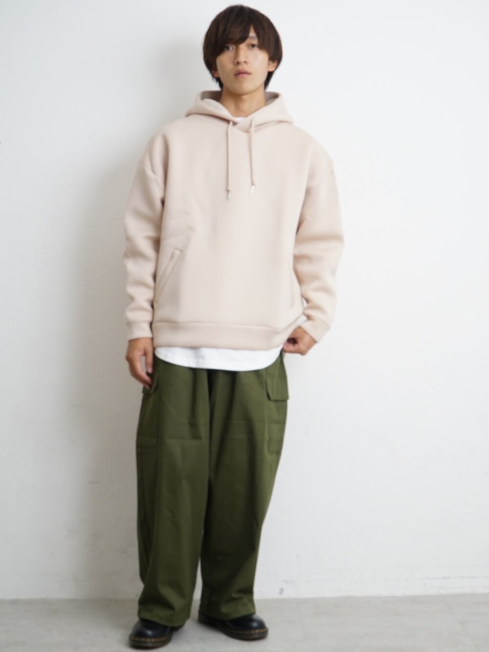 REONのカーゴパンツ「【MinoriTY】スーパーワイドカーゴパンツ ワイドパンツ ミリタリーパンツ ワークパンツ メンズ 秋服」を使ったコーディネート