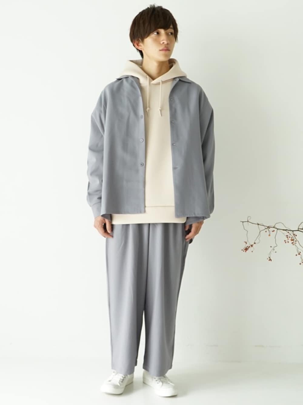 REONのセットアップ「【MinoriTY】落ち感ドルマンシャツセットアップ ワイドパンツ メンズ ビッグシャツ オーバーサイズ ルーズフィット ビッグシルエット 秋服」を使ったコーディネート