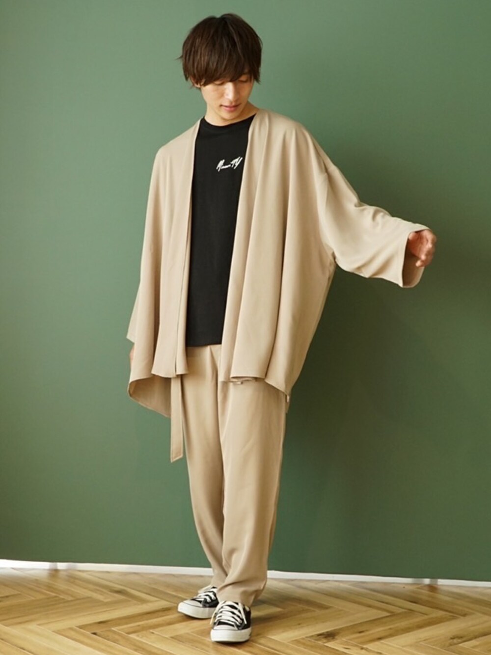 REONのセットアップ「【MinoriTY】とろみ素材セットアップ ロングカーディガン ベルト付きワイドパンツ 秋服 メンズ」を使ったコーディネート