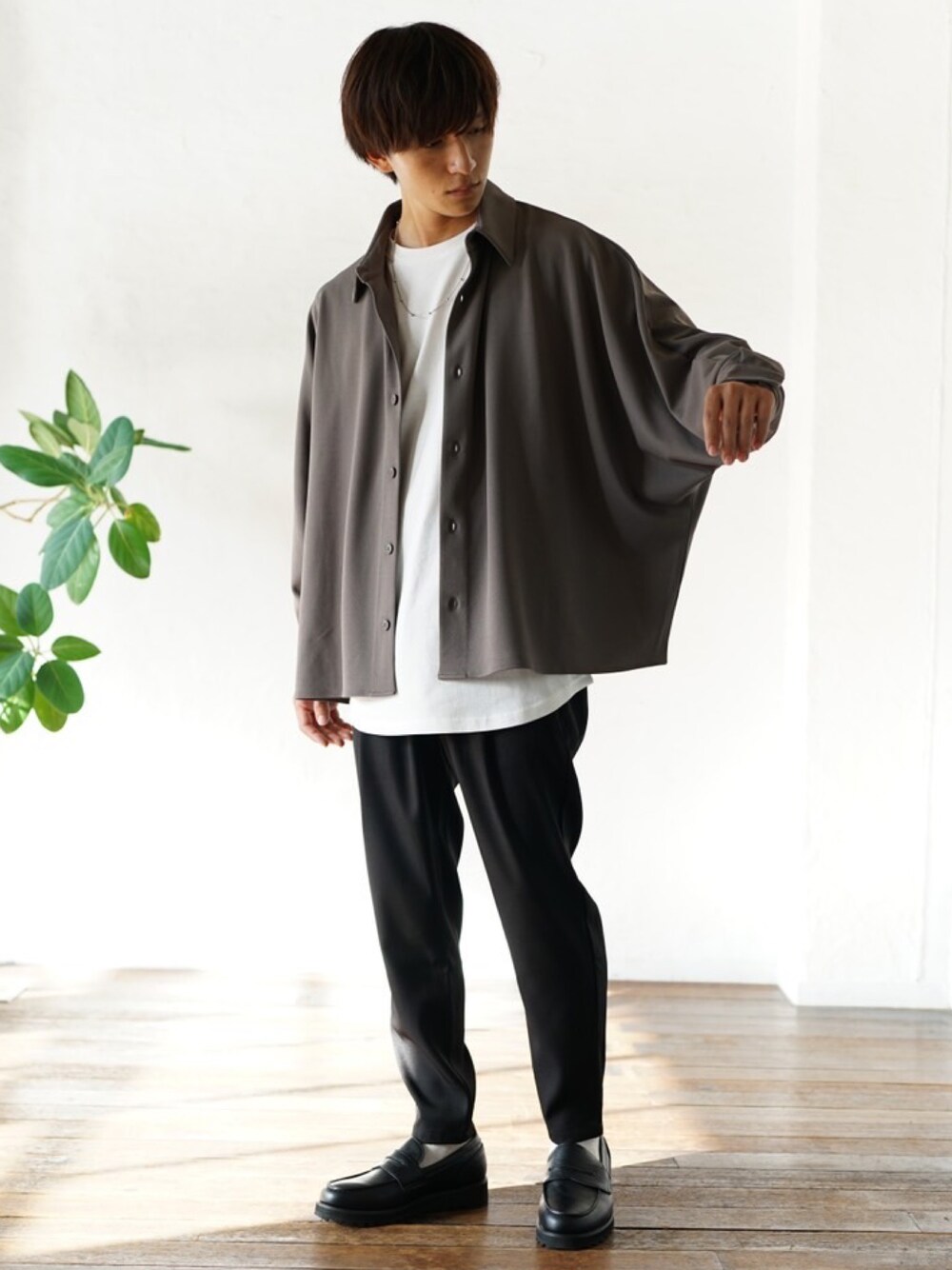 REONのセットアップ「セットアップコーデ3点セット ドルマンシャツ+インナー+テーパードパンツ」を使ったコーディネート