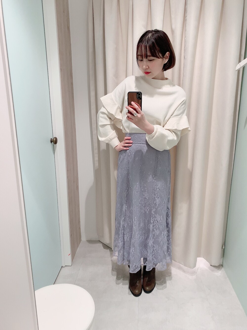 web限定のnew osonoスカート🥰 着用のサックスブルーのカラーが春らしくてとてもかわいいです✌🏻 丈感も折って調節ができる作りになっているので、高身長〜低身長の方まで幅広くはけます🪄
