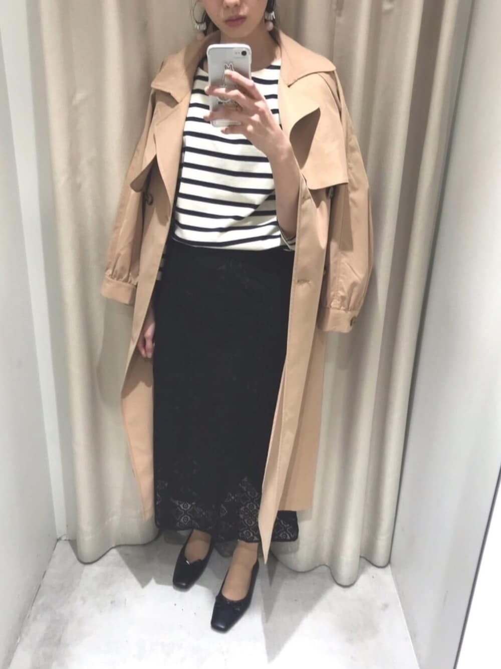何枚あっても便利なボーダーは、モノトーンにしたり、レディなレーススカートと合わせるとカジュアルになり過ぎず、大人の方におすすめのコーディネートです! カットソー -------------------- 透け感:なし (裏地:なし) 伸縮性:なし 生地の厚さ:しっかりめ ------------------- サイズ感:ドロップショルダーなのでゆったりめの着こなしに 素材感: しっかりと目の詰まった素材です 着心地:やや硬めの素材ですが、ごわごわ感はありません。 スカート -------------------- 透け感:裾は透け感があります (裏地:あり) 伸縮性:なし 生地の厚さ:薄手 ------------------- サイズ感:マーメイドシルエットで腰回りはややタイトです。165センチでミモレ丈くらいになります。 素材感: 繊細なレースのお作りで、春〜夏にかけて使い勝手の良い素材です。 着心地:サイドジップなので腰回りがスッキリしたシルエットです。タイトすぎないので歩きにくさもありません。