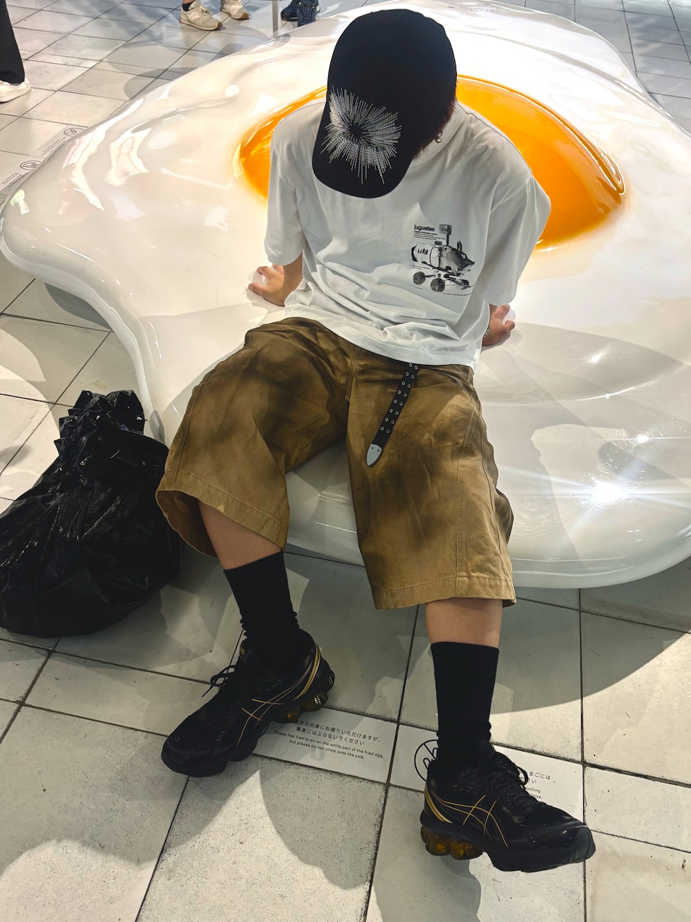 万博に行った日のこーで いくらなんでも暑すぎたのでTシャツにジョーツ、スニーカーのラフスタイル これでなお歩きすぎて足が破壊された。。。