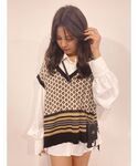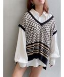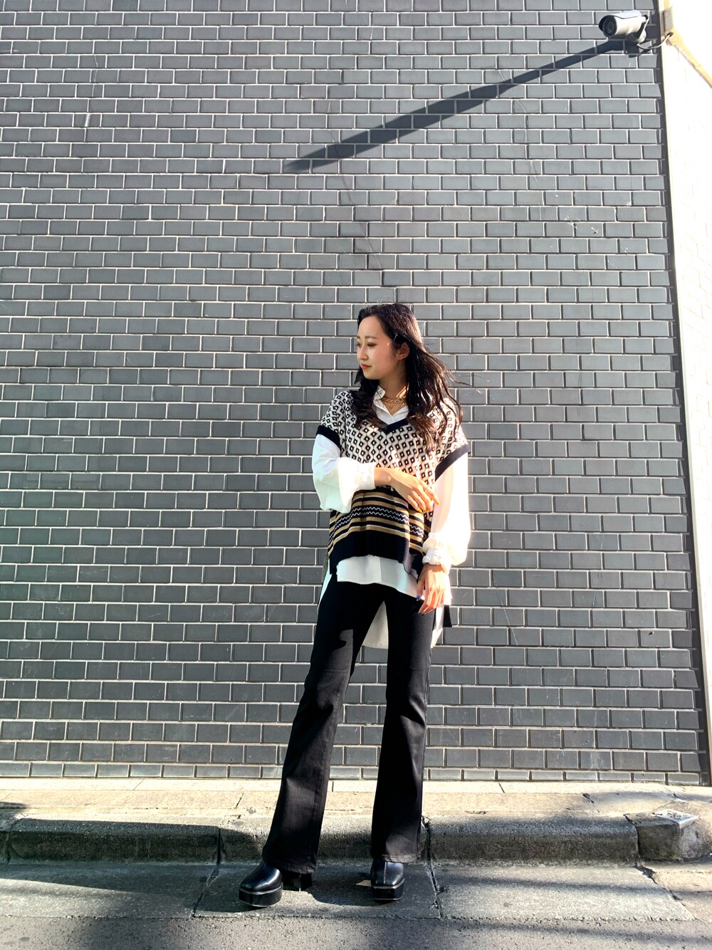 “ギャザーショルダーシャツ×ジャガードニットベスト“ シャツとベストは大きめのお造りなのでワンピ風にも着て頂けます❤︎私は、フレアデニムと合わせてカジュアルでかっこよくきてみました❕ EVRISにしかないこのニットの柄が可愛すぎます😆❤️