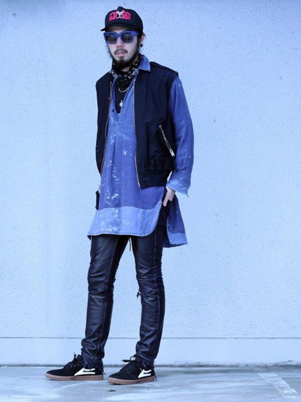 ベスト、パンツ : TAKAHIROMIYASHITATheSoloist. シャツ : 古着 シューズ : lakai サングラス : Celine