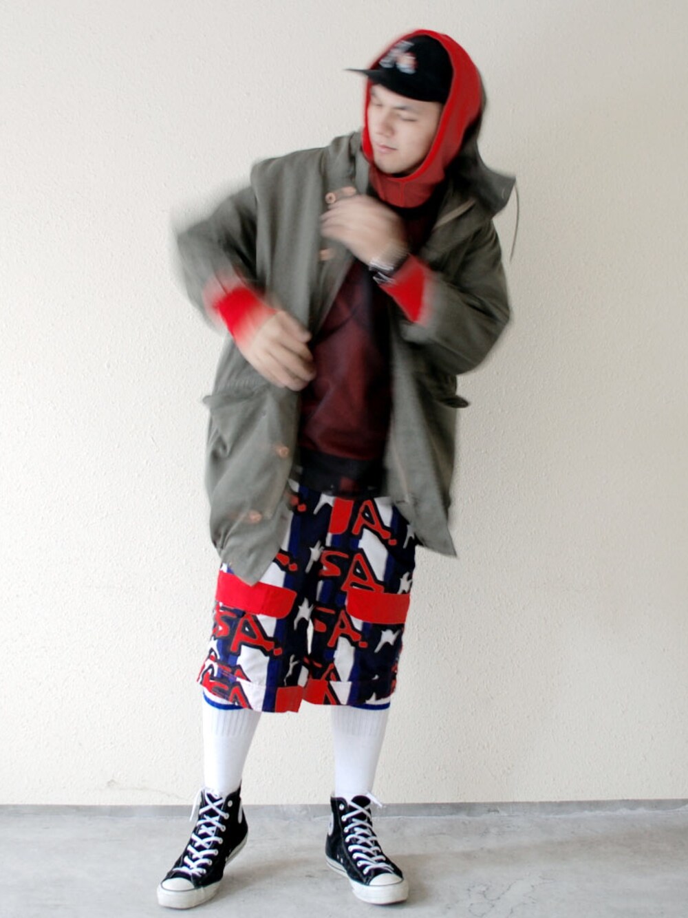 Remake military jacket by Xuly Bet 🇫🇷 Over sized see-through tee by Francoise 🇨🇭 Shorts by vintage Stephen Sprouse 🇺🇸