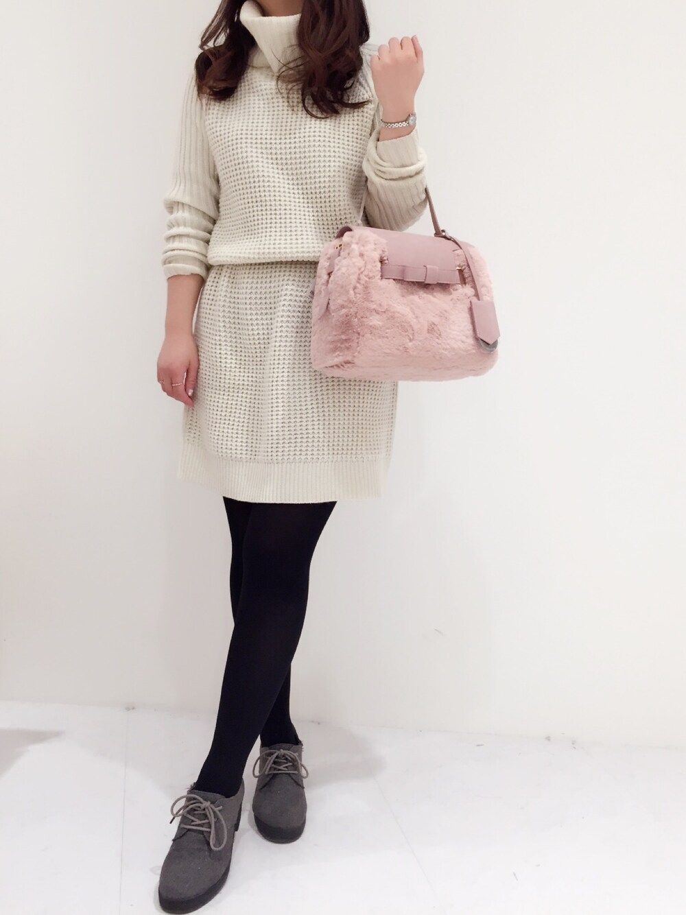 ユニクロのニットワンピはセットアップ風に着たくてワンサイズアップで購入しました♡ 白ニットにサマンサタバサのファーバッグで久しぶりにガーリーテイストです