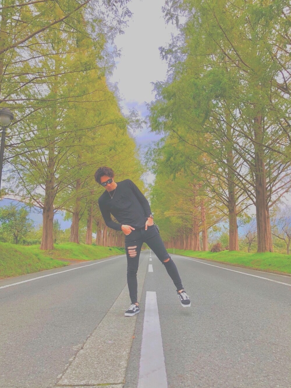 メタセコイヤ並木に立つ黒
