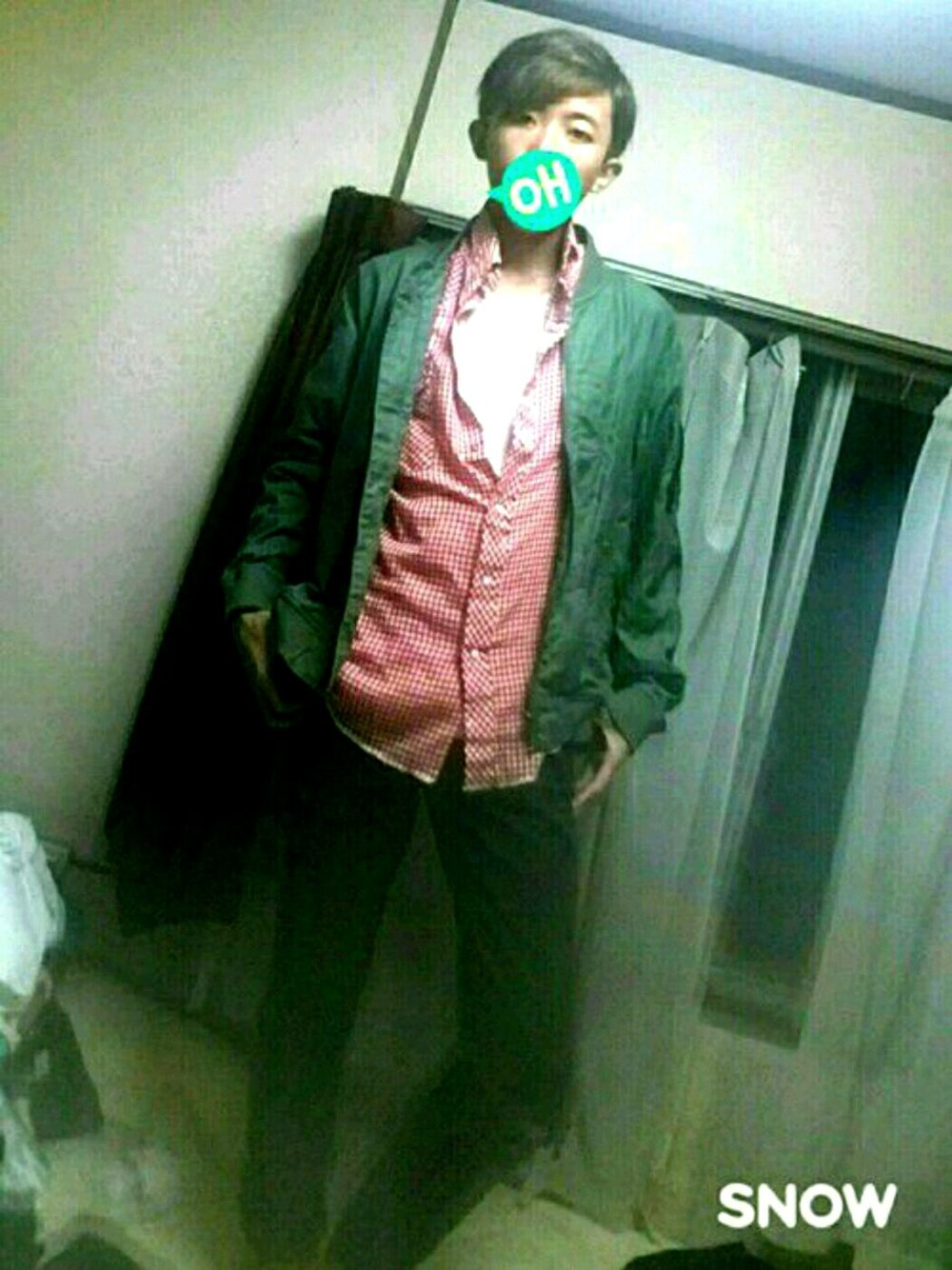 ふつだったら中にチェックシャツを着るところを 最近流行りの青ではなく赤のギンガムチェックに 明るい印象あっぷ。