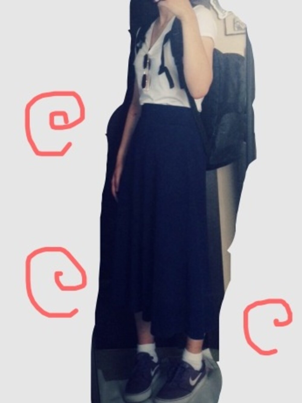 白Tシャツ:H&M スカート:RayCassin 白ソックス: バックパック:おさがり