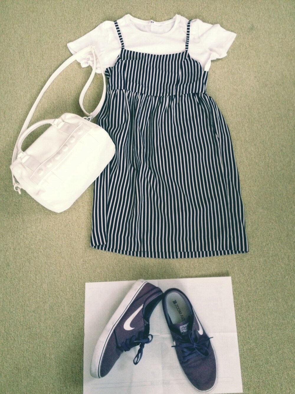 ユニクロのTシャツに、 キャミワンピ着て終わり。 NIKEのスニーカーで外す。