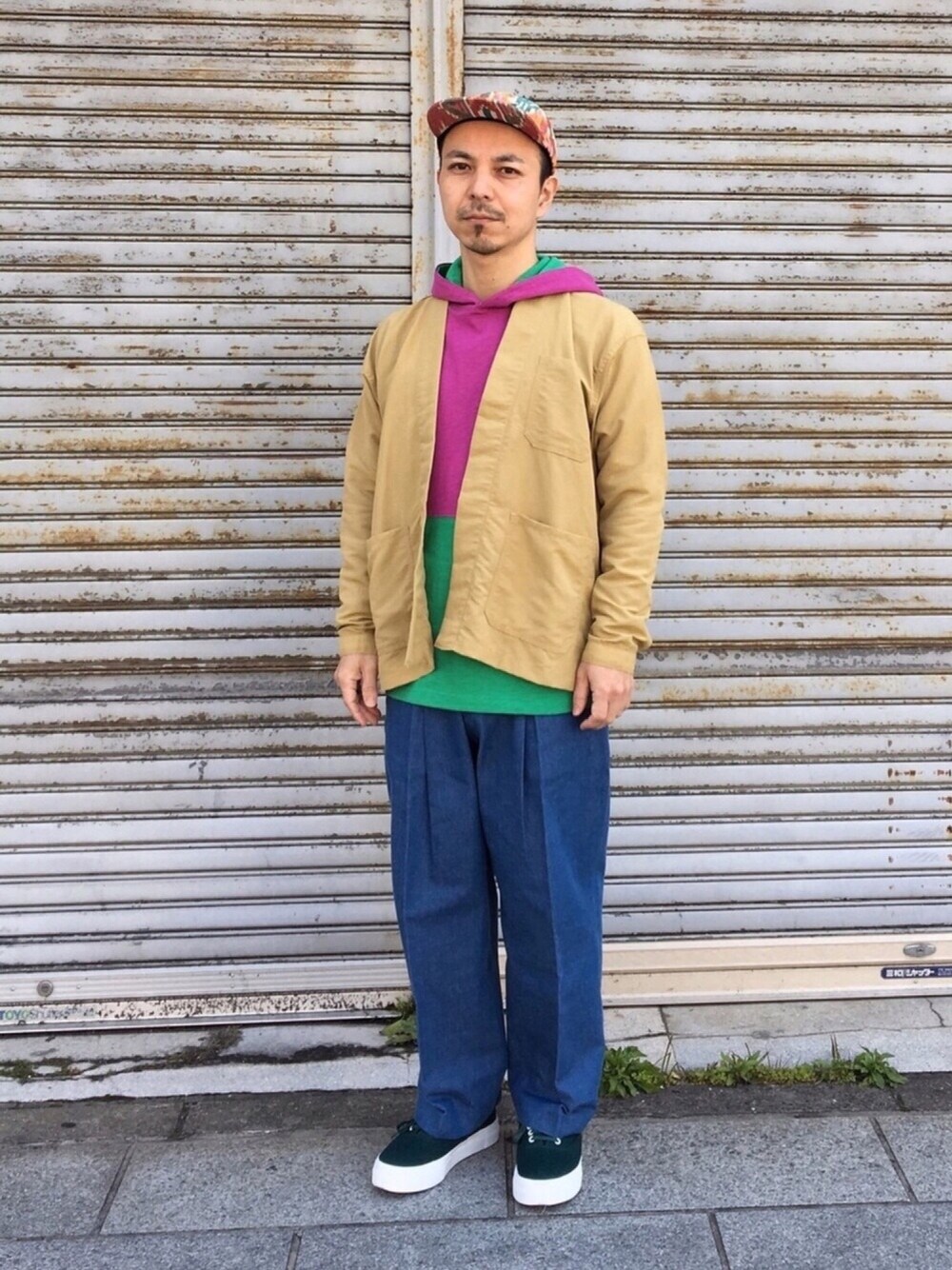 アウターは BRAIN DEAD のノラギシャツ。この手のデザインには珍しい薄手のナイロン素材。 sakakiのワイドパンツと合わせつつ、パッと見は和っぽく見えないようにしてみました。 カラーは春を意識して明るめで。