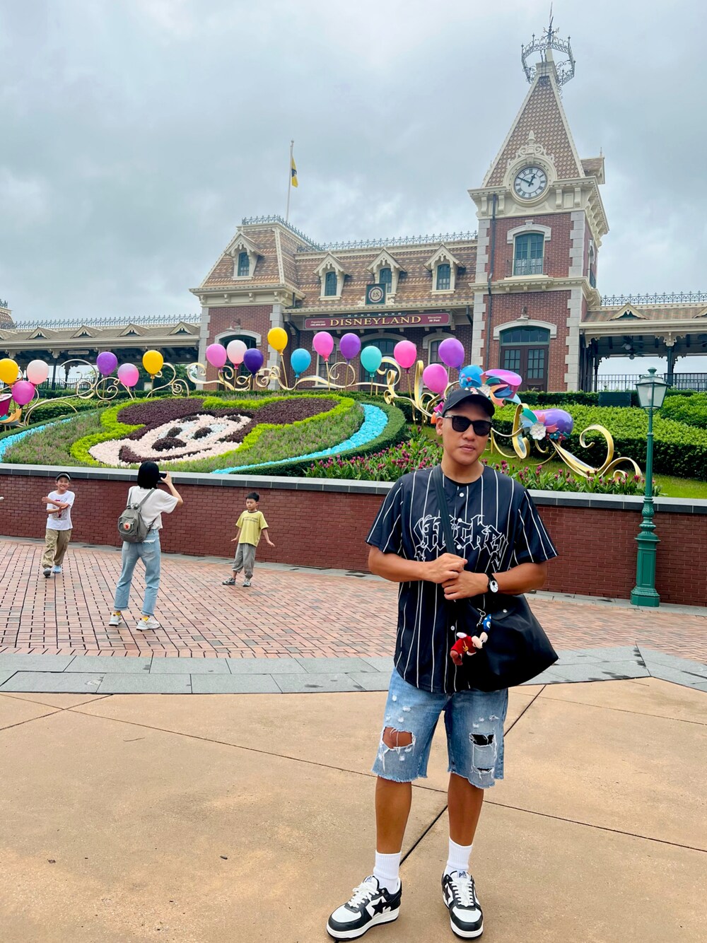 ◾️top: Disney ◾️pants: H&M ◾️shoes: a bathing ape ◾️bag : longchamp ◾️sunglasses: Tom Ford ◾️cap : MLB