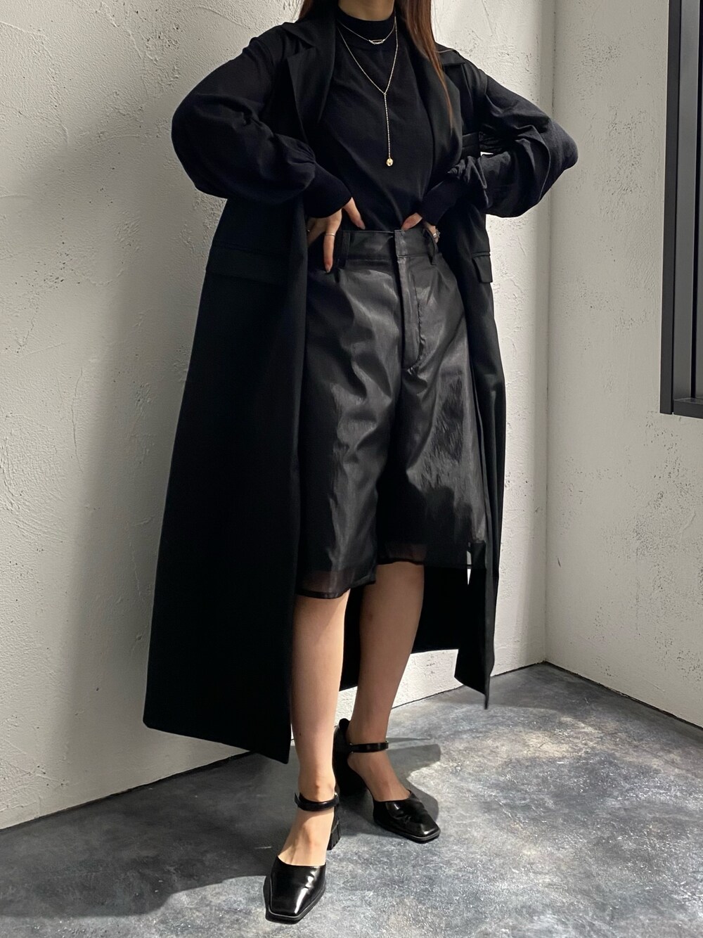Instagramも見てくれると嬉しいです🌿 異素材合わせでオールブラック。 ロングベストはモードに、でもゆるっと着れます。 生地感は春や夏にも使える暑さで、軽いニットの上に今の時期羽織ったりできます♪ 長さも脛下あたりなのでぺったんこも◎ 全体が重くならないように足元をパンプスをチョイス。 オールブラックで変化をつけるためにシアーや艶のあるおしゃれハーフパンツを合わせました♪
