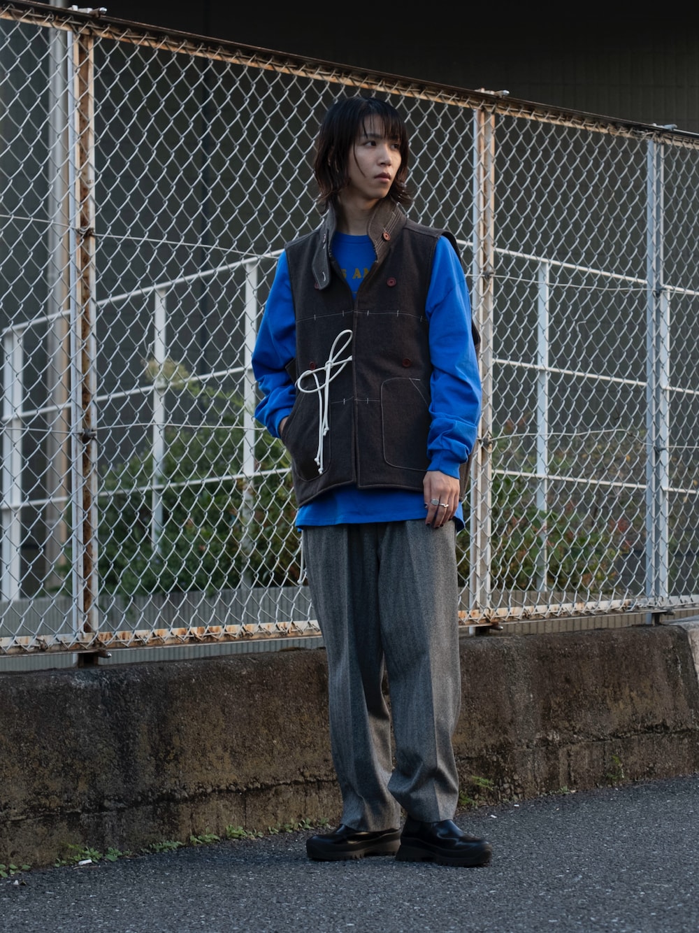 ブラウン系のベスト、グレー系のスラックスを着用したメンズの秋コーディネートの1枚目の写真
