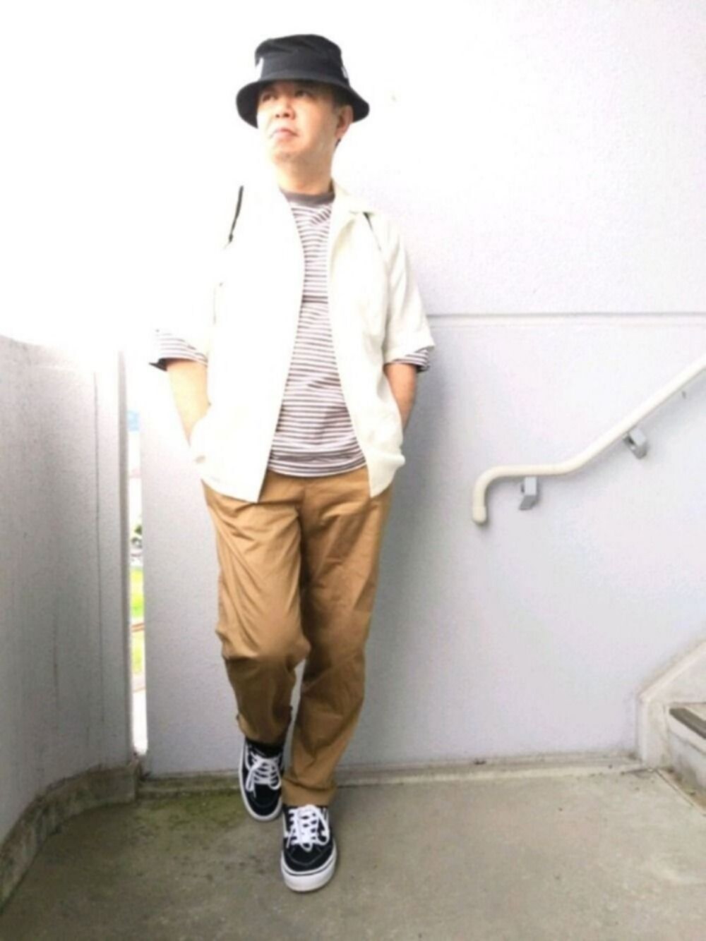 こんばんは!いつも、いいね!お気に入り閲覧ありがとうございます☺️🙇 本日、2投稿目です。 2投稿目はチャオパニックティピーのコーデです。 シャツはパナマ織りオープンカラーシャツのホワイトをチョイス。 ボックス気味のルーズシルエットにしたことで、トレンド感をプラス。 Tシャツ1枚では隠せない体型カバーにもなります。 パナマ織り特有の表面感のある生地は、常にドライな着心地で着用出来ます。 インナーはオーガニックコットンボーダー半袖Tシャツのベージュをチョイス。 適度な肩の落ち感、ボックスシルエットで1枚着でもこなれた印象に。 ボーダー幅を狭くすることで綺麗めデザインヘ昇華。 上質でなめらかな触り心地のコットン素材を使用。 厚みもあり透ける心配もありません。 自宅でケアも出来て吸水性、耐久性に優れているのでディリーに使えます。 足元は、お気に入りのVANSの軽量スニーカーの黒をチョイス。 凄く軽くて履き心地が良く疲れません。 パンツは、ディリースタイルアップチノのベージュをチョイス。 裾がダブルに仕立てられており皺になりにくいです。 腰のあたりにはゴムが入っており、ウエストまわりを締めつけずストレス感がなく履けます。 更に動きやすく履き心地は😎👍✨◎ 背中には、まさあきさんのオリジナルブランド ロウジャックデザインのナップサックを着用しました。 ロウジャックデザインのロゴが山型に配列されており口を絞ってもロゴが隠れません。 ハットはニューエラのバケットハットを着用しました。 動きやすさと着心地の良さを兼ね備えた大人カジュアル夏コーデになりました。