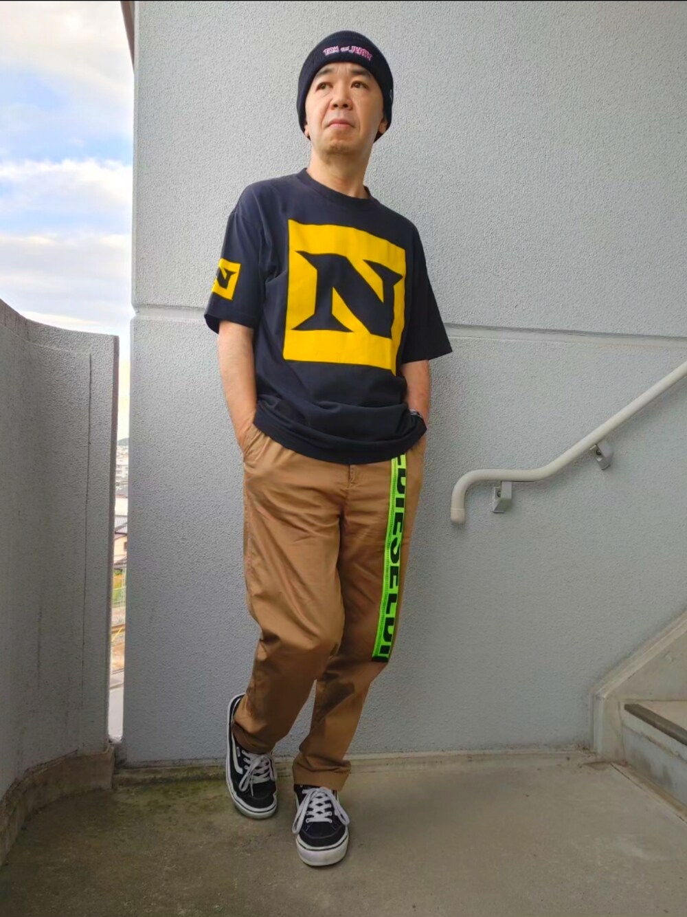 お疲れ様です! いつも、いいね!SAVEそして閲覧をして頂き、ありがとうございます!🤗🙇✨ Genさん、素敵なフォルダーインありがとうございます!🤗🙇✨ 凄く励みになり嬉しいです!🤗🙇✨ 本日のコーデは溜め撮りになります。9月の初め頃撮影しました。 シンプルスタイル 古着MIXカジュアル秋コーデになります。 トップスは、古着のTシャツをチョイス。 カラーはブラックになります。 丈夫な生地感でサラッと着用出来ます。ブラック×イエローのツートーンカラー。 フロントのNの文字がお洒落な遊び心のある1枚。 ベルトは、DIESELのベルトをチョイス。カラーはネオングリーンになります。 パンツは、チャオパニックティピーのディリープレミアム アップチノのベージュをチョイス。チノパンになります。 裾がダブルに仕立てられており、皺になりにくいのが特徴です。 腰回りにはゴムが入っており、腰回りを締め付けずストレス感がなく穿ける お洒落な1本。 自宅で簡単に手入れが出来るのも◎。 足元はVANSの黒のスニーカーをチョイス。 凄く軽くて履き心地が良く、疲れません。 キャップは、NewEra×トムとジェリーのコラボアイテムのニットキャップをチョイス。 カラーブラックになります。 トムとジェリーといえば追いかけっこ。 トムとジェリーの世界観をニットキャップに 収めた遊び心のある1品。 もちろん、被り心地は保証付き👍😎✨ 長文失礼しました🙏🙇 本日も宜しくお願い致します!🤗🙇✨