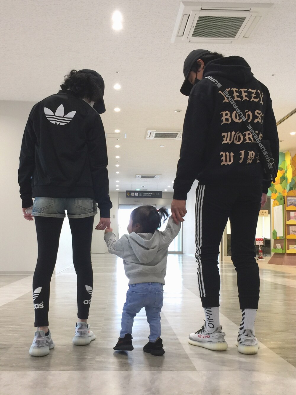 週末に家族揃ってアディダスコーデでお出掛けしました。足元はパパ、ママ、子供、揃ってイージーブーストで合わせました(^o^)