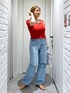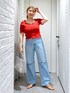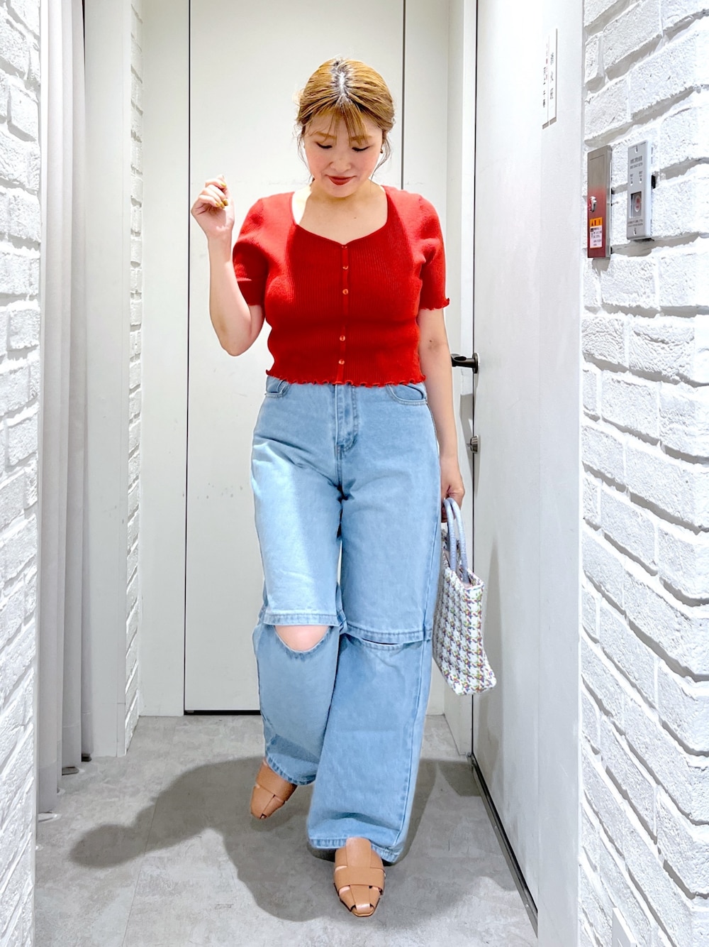 シンプルにニット✖️デニムで夏コーデ☀️ 赤ニットはオレンジ寄りのカラーでイエベさんにおすすめ🥰 (骨格ストレート/イエベ春/普段サイズM)
