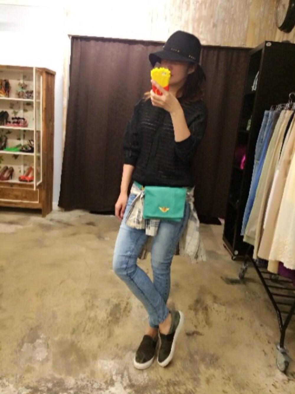 透視感黑襯衫 雪白牛仔skinny 迷彩便鞋 法國設計師品牌包包