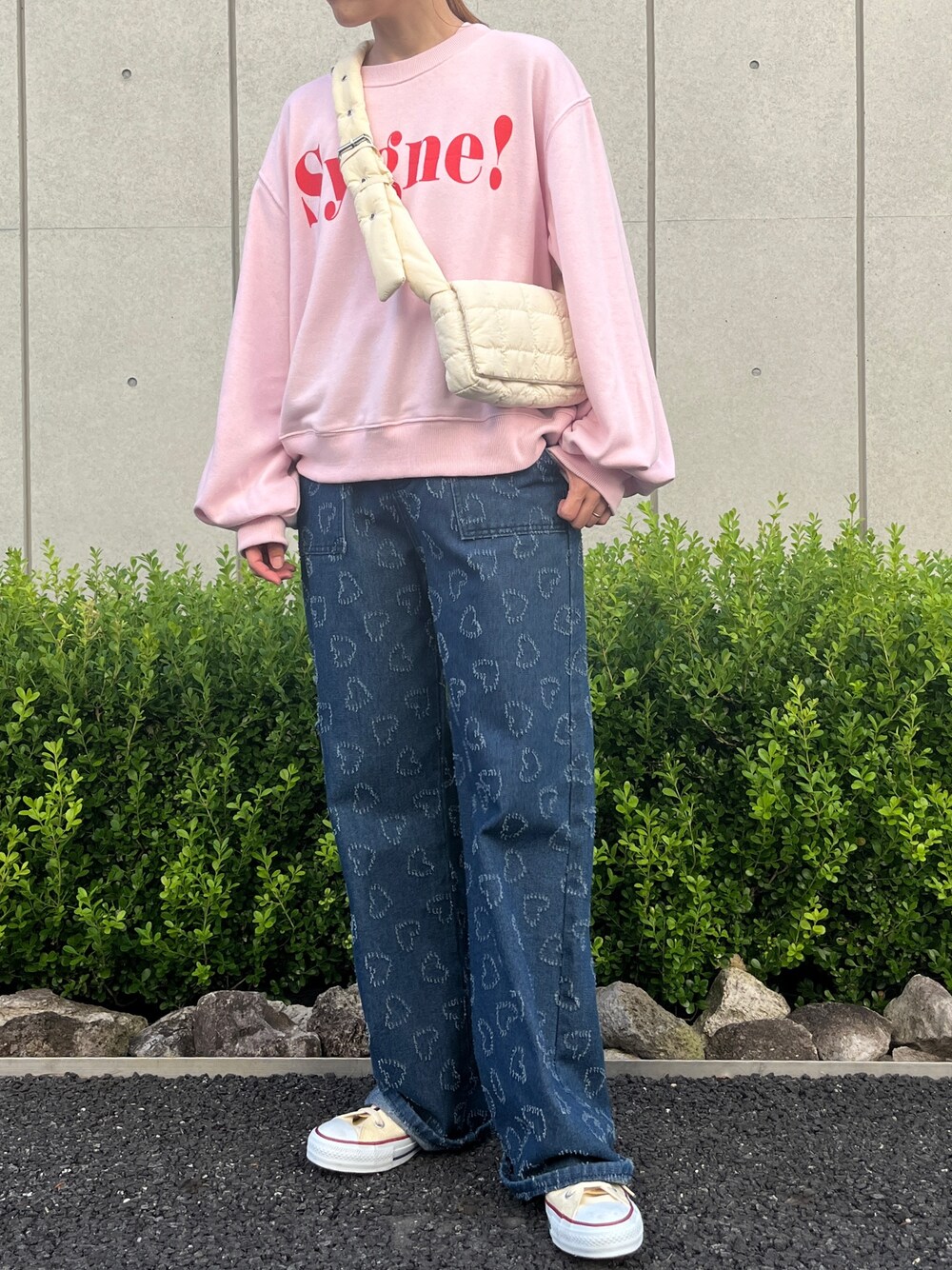 袖ボリュームがかわいいスウェット とハート柄がポイントのデニムで カジュアルコーデ🩷🩵