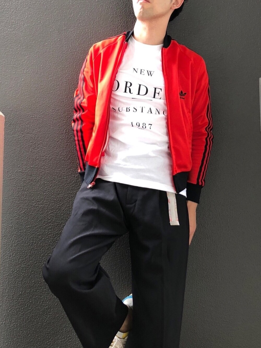 80年代のUKロック&ダンスの雄、ニューオーダーのTシャツがH&Mから発売されたので喜び勇んで買っちゃいました。 赤ジャージを羽織り、今回はワイドパンツで全体のシルエットにメリハリをつけてみました。