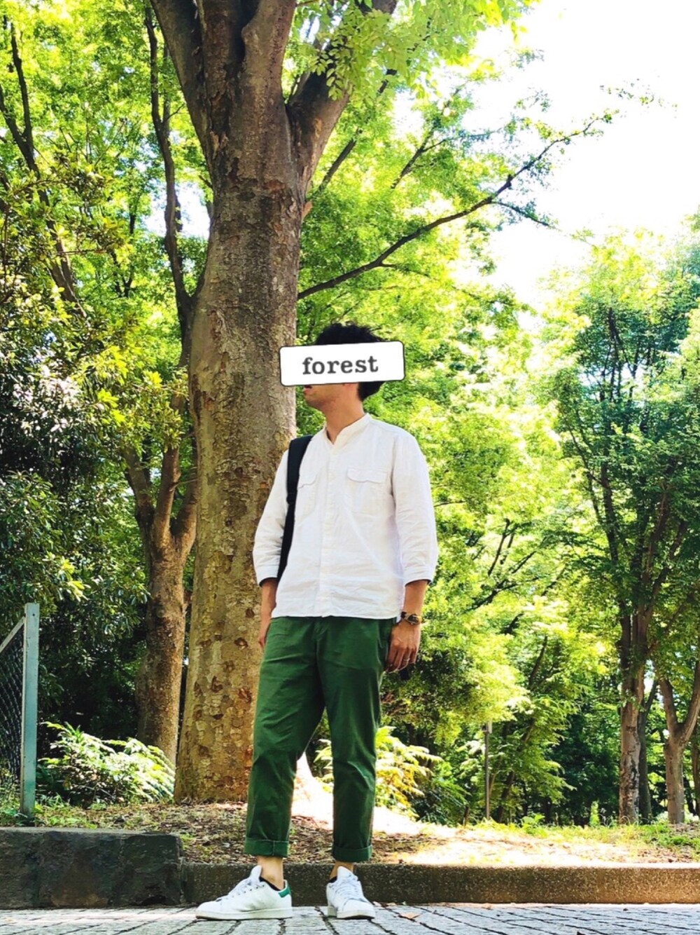 白&緑コーデです。 暑い日が多くなってきたので、見た目的にもあまり暑苦しくならないようにしています。 緑の多い公園を通ると、すっと涼しくなっていいですね。