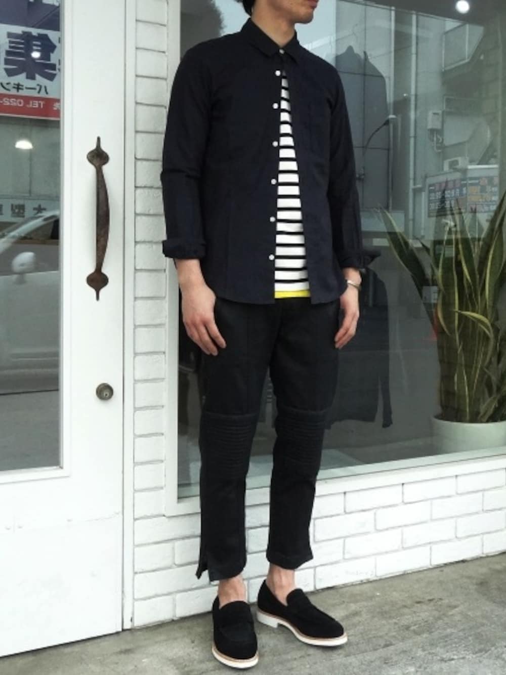 全体的にネイビー・ブラックといった暗めのカラーを使ったコーディネート。インナーのボーダーとイエローのカットソーの差し色で、メリハリをだしています。