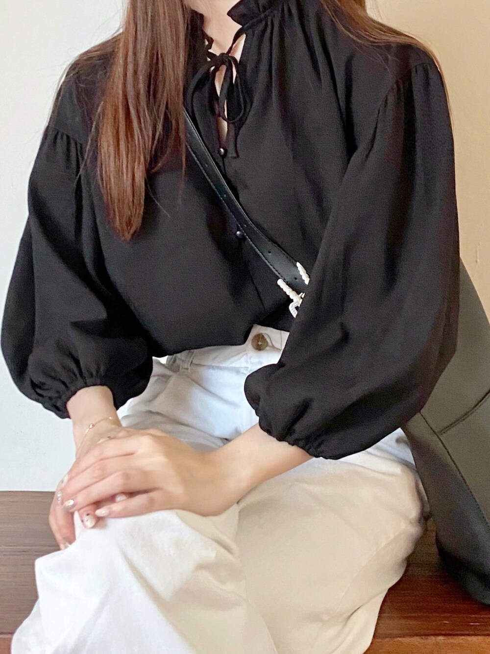 \旅行コーデ/ シンプルな白黒コーデで絶対間違いない、ボリューム袖はポイントです❣️