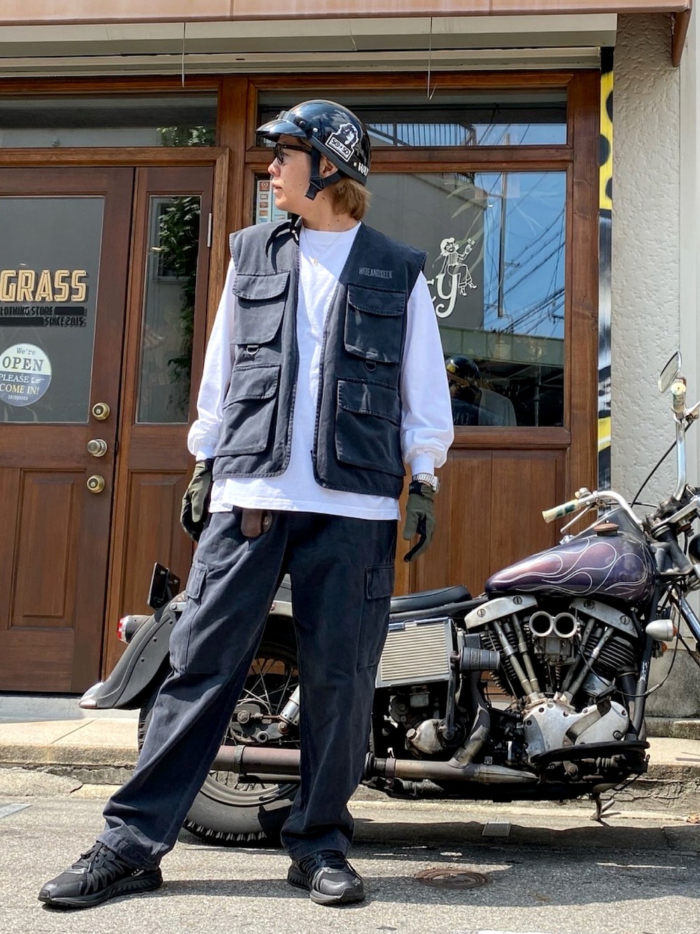 FAGRASSのベスト「ベスト / HIDEANDSEEK(ハイドアンドシーク) / FISHING VEST(PIGMENT DYE)(BLACK)(HJ-080224)」を使ったコーディネート