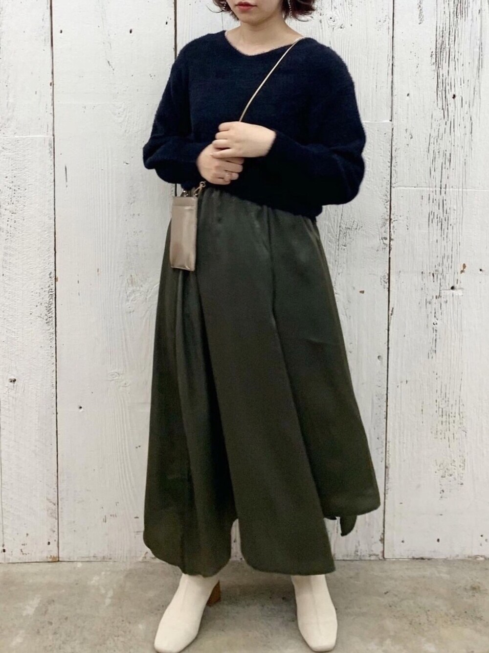 ニット -------------------- 透け感:なし (裏地:なし) 伸縮性:あり 生地の厚さ:中肉 ------------------- サイズ感:ゆとりあり 素材感: シャギーニット 着心地:軽く、暖かい スカート -------------------- 透け感:なし 伸縮性:ややあり 生地の厚さ:薄手 ------------------- サイズ感:ウエストゴム、やや長め 素材感: サテン 着心地:軽く、楽ちん