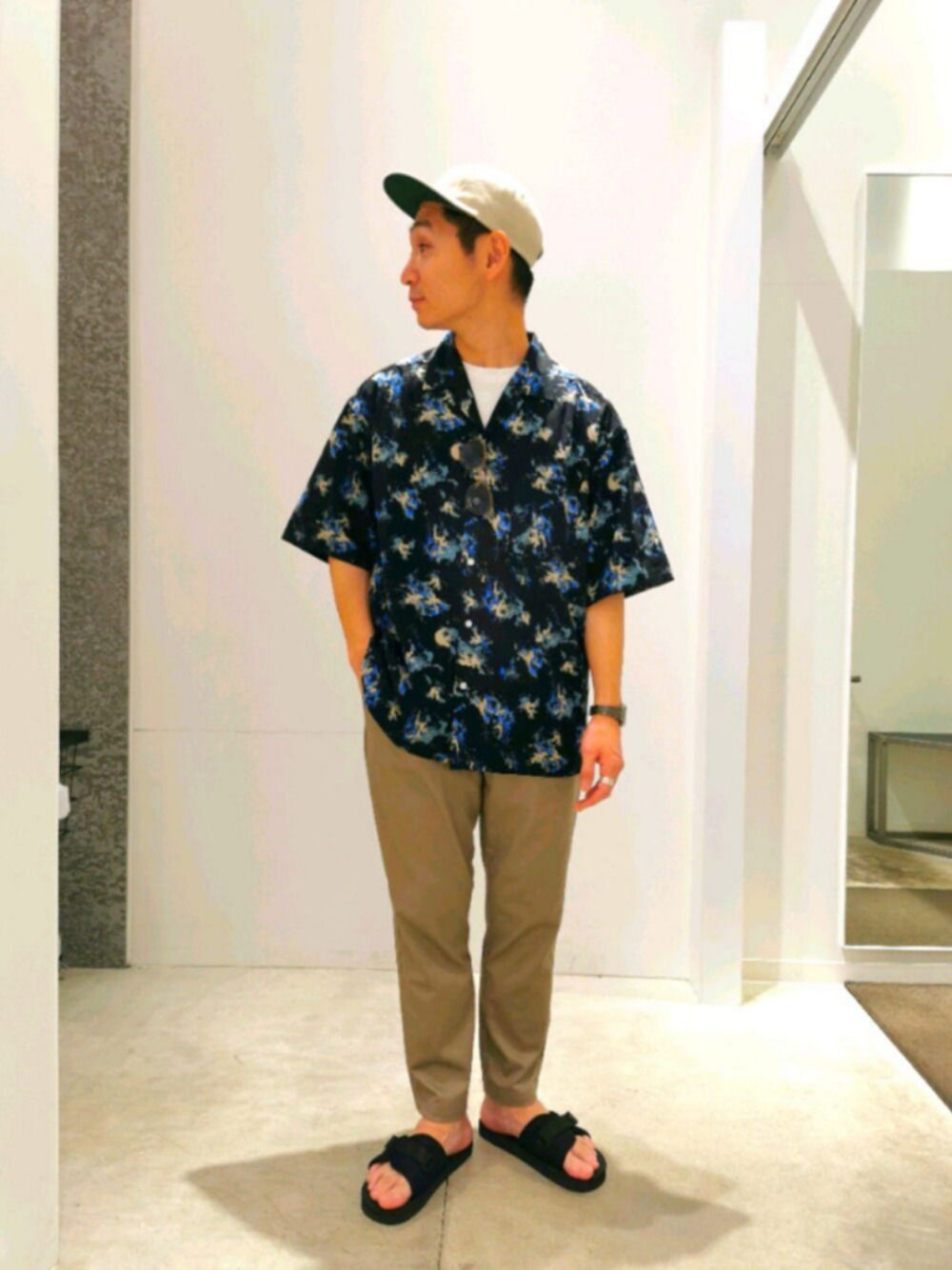ラコレのスプラッシュ柄のオープンカラーシャツを使ったコーデ😋 カラーパンツということで、今回はグレージュの色味をチョイス!