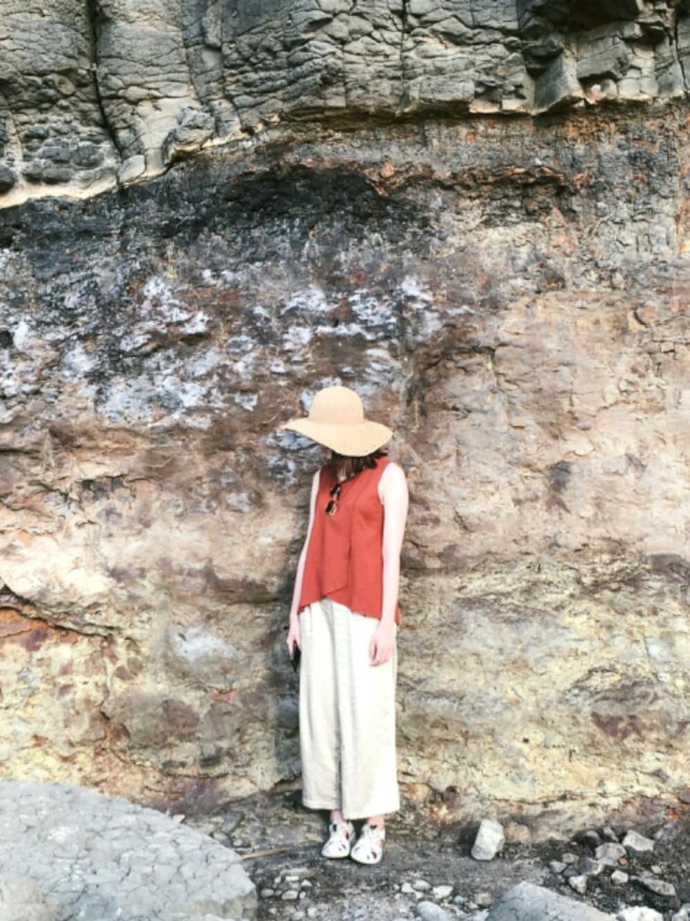 オレンジ系のトップス、ベージュ系のサンバイザーを着用したレディースの夏コーディネートの1枚目の写真