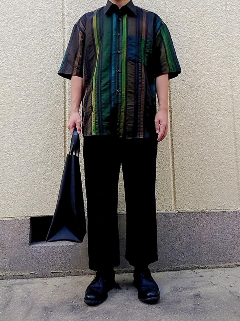 D&Gのシャツを生かしたコーデ!! 古着屋yutoriで購入させていただきました! 背面には赤色とかもう少し多くの色が使われています! Aetaのバッグもシンプルながら、使いやすくエコバッグの代わりにも使っています😀
