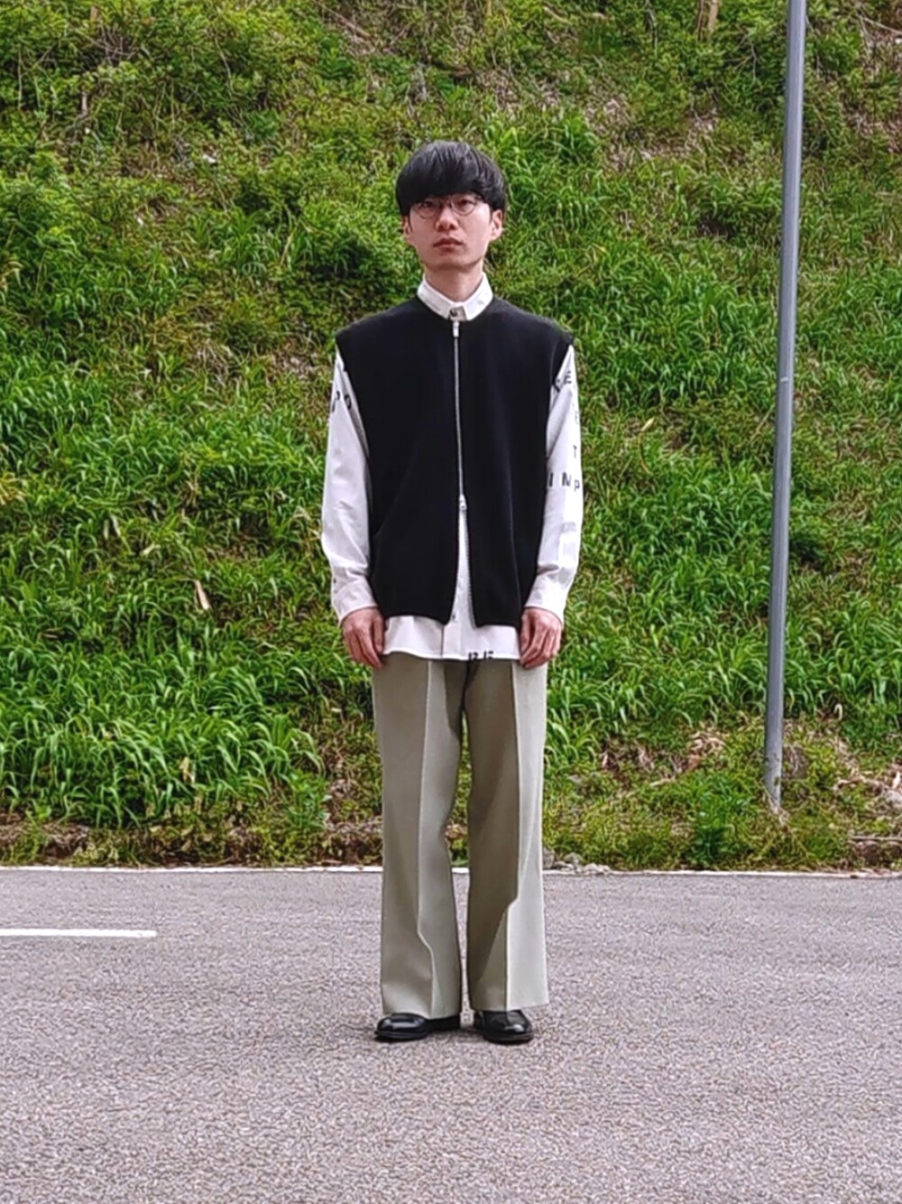 90年代のジップアップのベストを使ったコーデです。 シャツの柄が腕から見えることでカジュアル感があってお気に入りのコーデです。