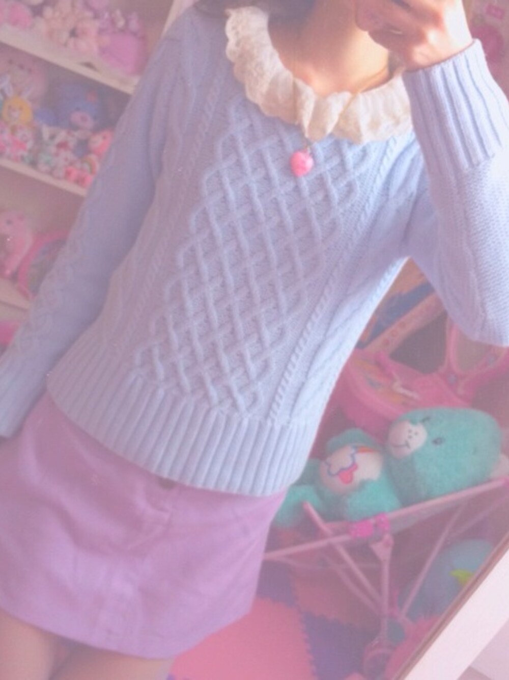 ブルー系のニット/セーターを着用したレディースの春コーディネートの1枚目の写真