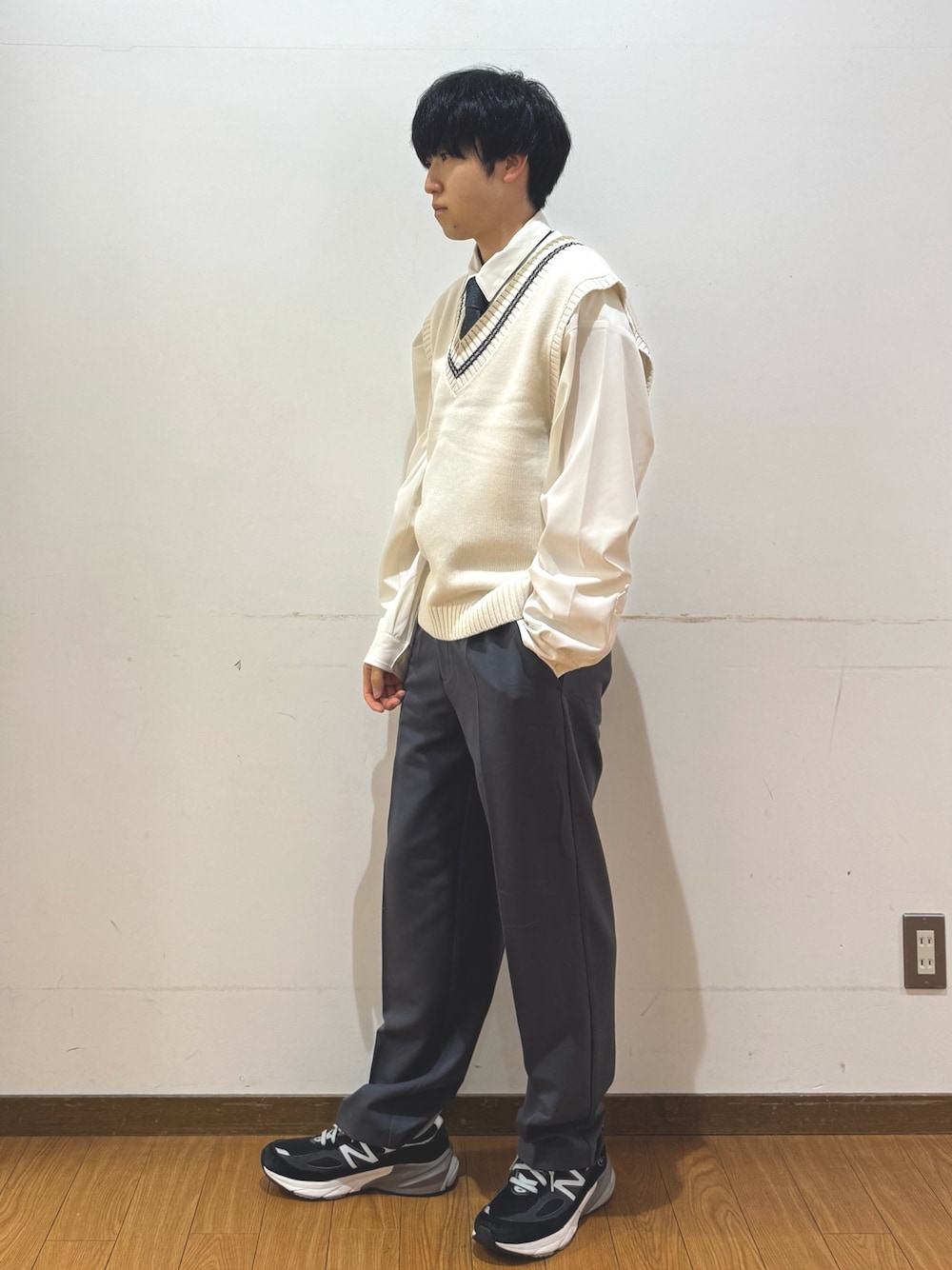 yuki(warehouse あみプレミアムアウトレット)のベスト「ウール混チルデンVネックニットベスト」を使ったコーディネート