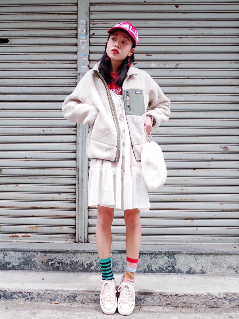 棒球帽 @humanmade 耳環 @gigglegiggletaiwan QQ毛外套 @patagonia_tw 粉紅團踢 @sunsetrollercoaster 白色罩衫 @fnd_studio 不同顏色ㄉ長襪 @viviennewestwood 粉膚1970 @converse 手鍊 @venessaarizaga @holasurfboutique 毛毛手拿包 @senseofplace_urtw 黑運動短褲 @adidas