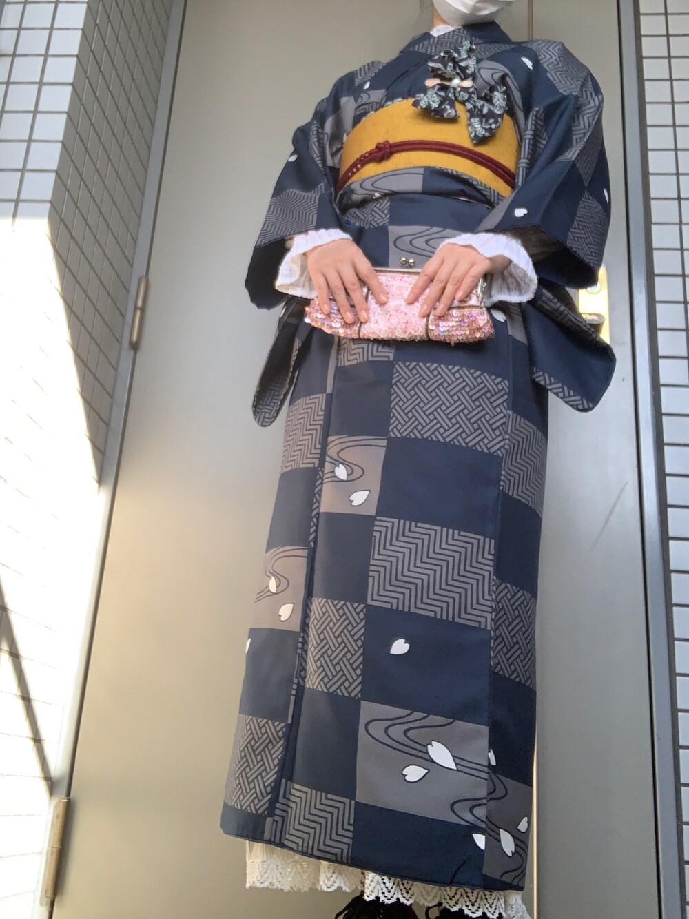 桜を見に行った時のコーデ。全身図写真ないのでこれだけど、夕方の桜がとても綺麗だった。先日久しぶりに着て酷過ぎたので、今回は洋装ミックス、名古屋帯復習メイン。
