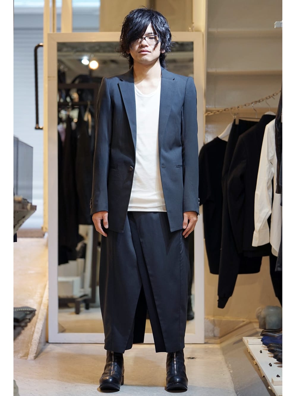 DEVOA Wool Jacket Charcoal individual sentiments Layered Short Sleeve DEVOA Wool HAKAMA Pants Guidi Front Zip Boots **The model is 167cm / 53kg wearing all size 1 and 42 for shoes