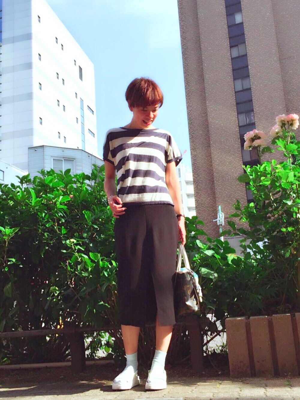 昼間はすっかり半袖。 懐かしのラグボンのボーダーと冬に買ったタイトスカート。 スカートが素足ではける季節なのが嬉しい〜。 久しぶりにスニーカーじゃなくて、サンダルはいてみたよ。