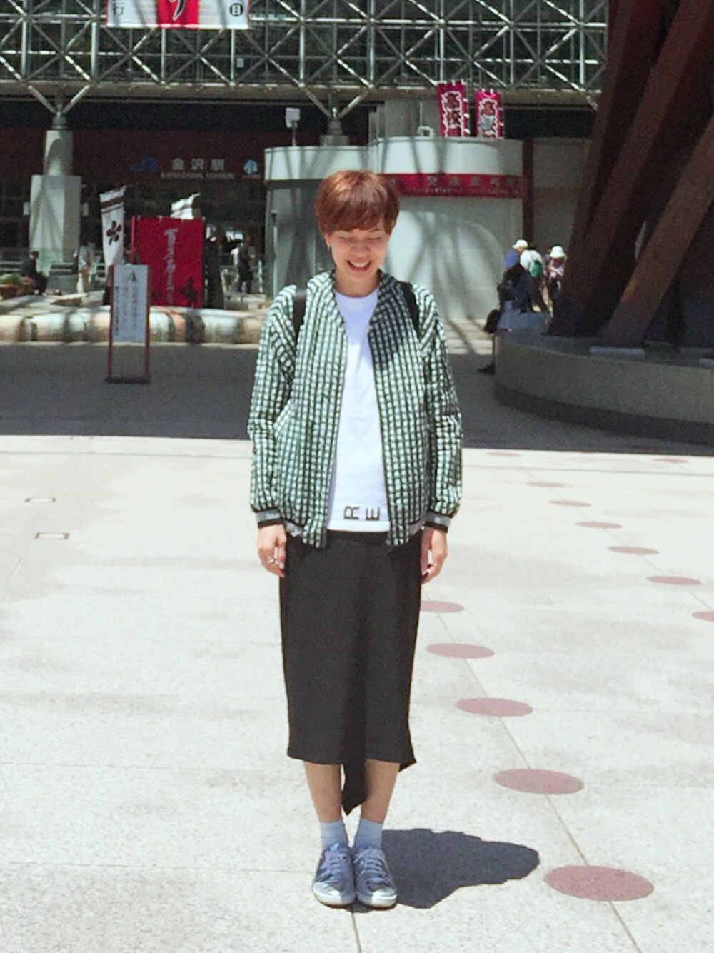 金沢にやってまいりました! ベタベタ観光スポットに! 昼間は26度で暑いから、中は半袖。 膝下のスカートにナイロンブルゾンがお気に入り♡