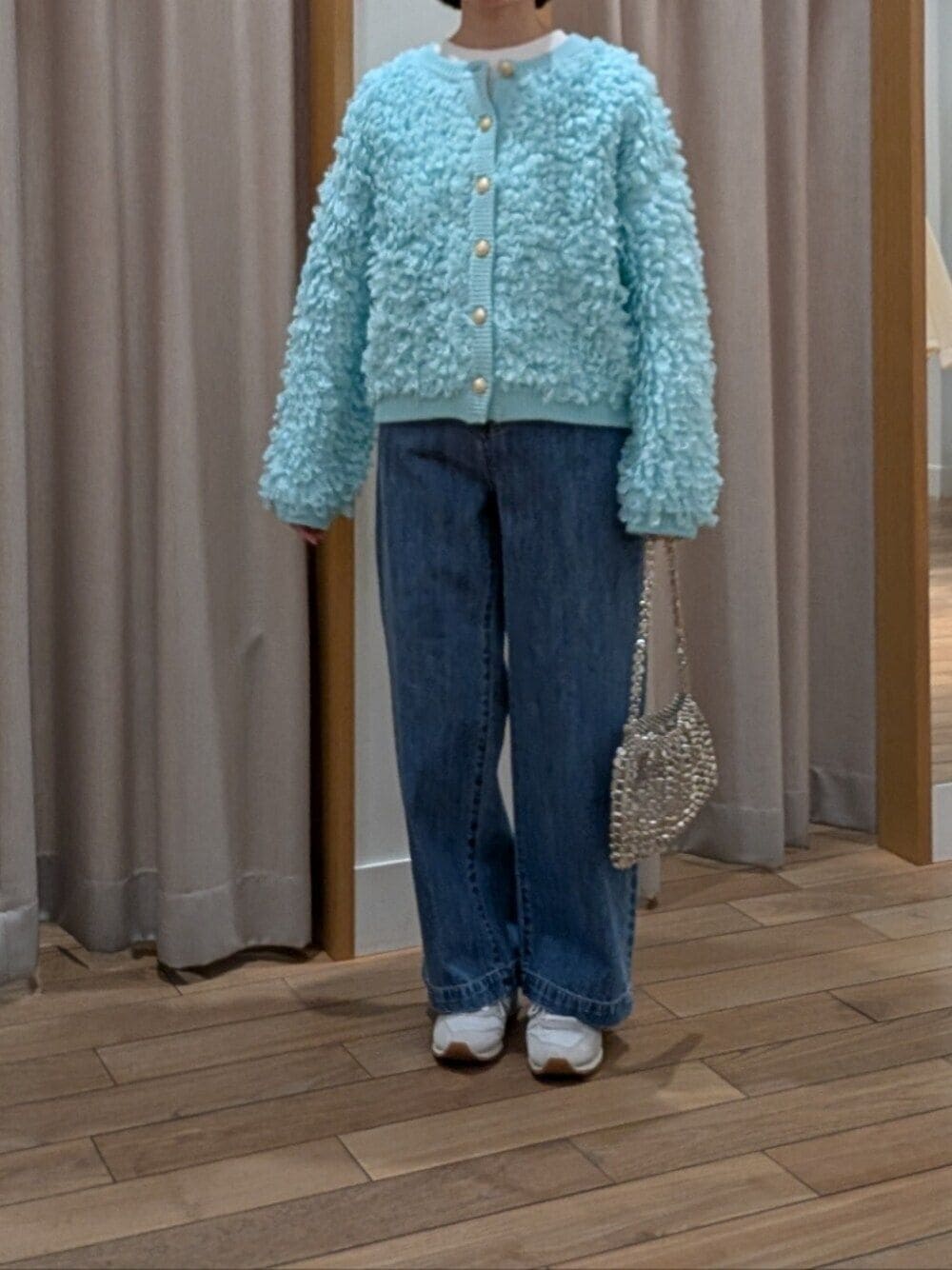 ニットフリンジカーディガン 一枚で着映えするカーディガンはシンプルな デニム合わせコーデでも華やかになります 金ボタンもワンポイント!