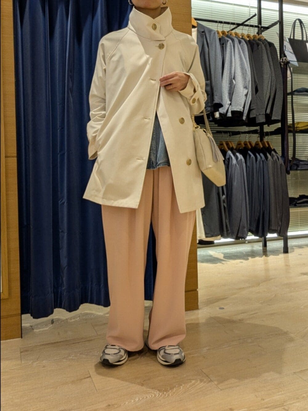 クリアツイル撥水スタンドカラーコート 季節の変わり目に嬉しい撥水機能つきコート! スタンドカラーデザインは顔周りがスッキリ見え、立てて着ても折り返して着るのも雰囲気が変わるのでおすすめです ミドル丈でヒップ周りがカバーできるのも嬉しいポイント シアーデニムドルマンシャツ 袖と背中にギャザーが入ったシルエットのかわいい デニムシャツ シアーデニム素材でコーディネートに抜け感が出せます タックギャザーパンツ とろみのある素材で落ち感が出てラインを拾わず履けるパンツ ウエストゴムでストレスフリー!なのに、きちんと見えするのでオン・オフ問わずに履きやすい1本です