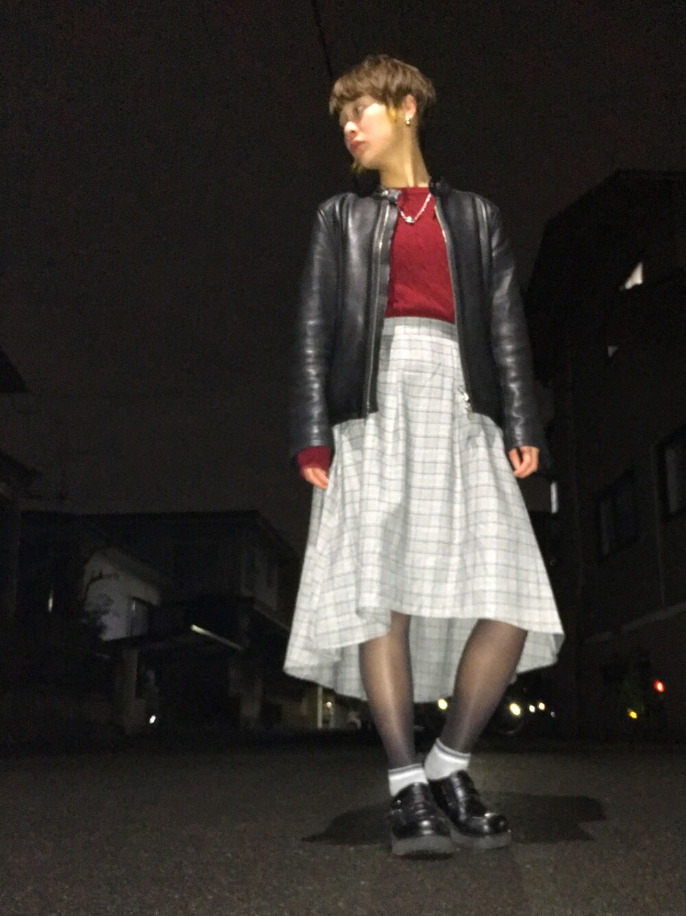 12/4 グレンチェックのスカート 後ろが長くて楽しい! 最近革ジャン多いな〜 よかったら、フォローお願いします( ¨̮ )